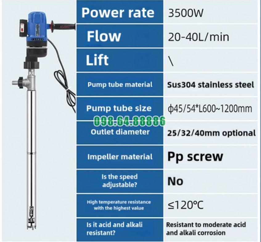 Máy bơm điện cầm tay hút thùng phuy JDT-3500W-LGG120 hoạt động đơn giản, hiệu quả, với động cơ mạnh mẽ và thiết kế bền bỉ, giúp bơm chất lỏng từ các thùng chứa lớn một cách nhanh chóng và ổn định.