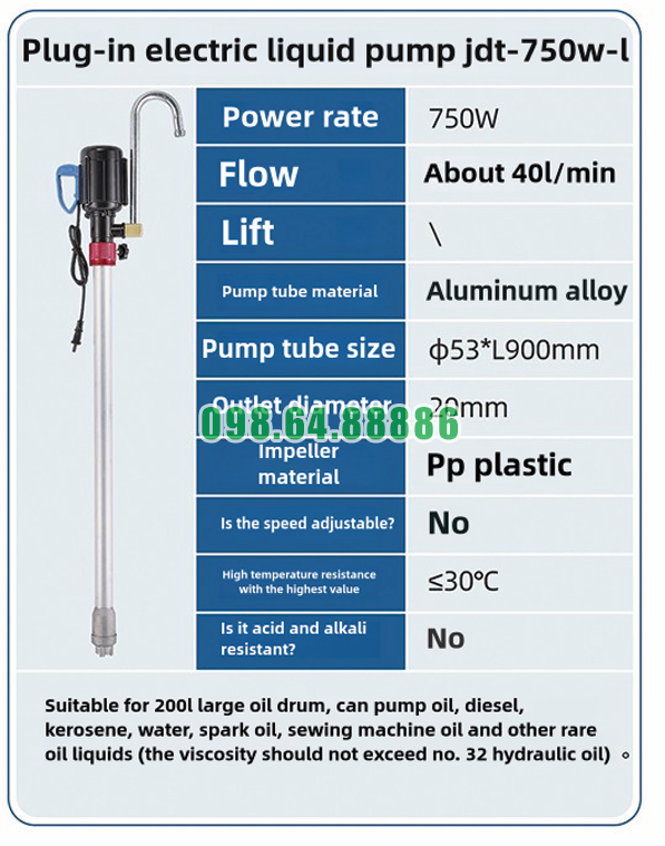 Giới hạn chịu nhiệt này cho thấy Máy bơm điện hút thùng phuy vỏ nhôm JDT-750W-L được thiết kế hướng đến nhu cầu bơm các chất lỏng thông dụng trong thùng phuy 200L, đặc biệt là các loại dầu và chất lỏng dạng dầu ở nhiệt độ thường.