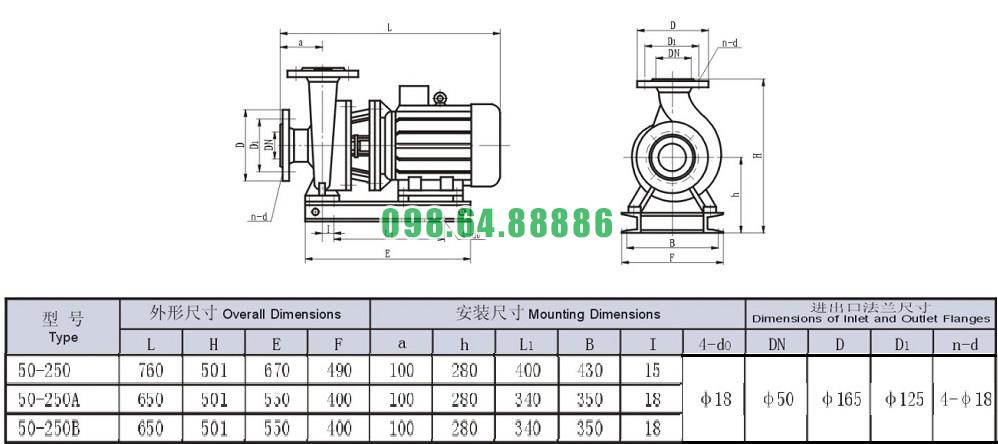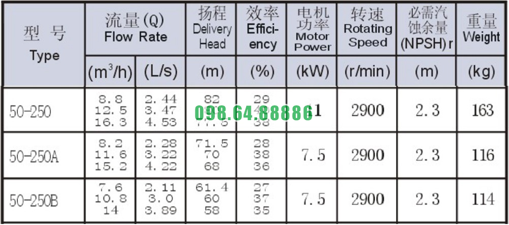 Bảng thông số kỹ thuật bơm nước trục ngang mã SLW-ISW50-250 động cơ 11 kw