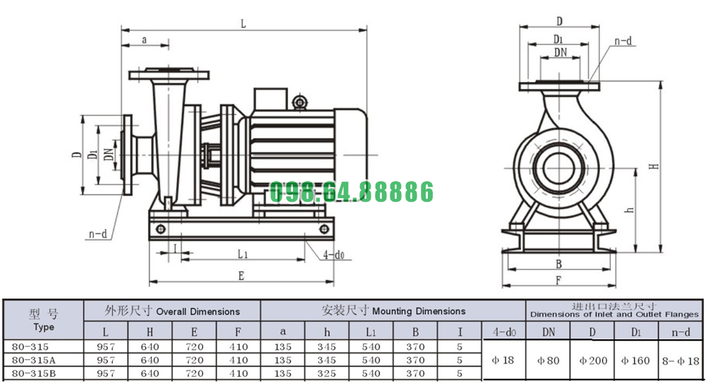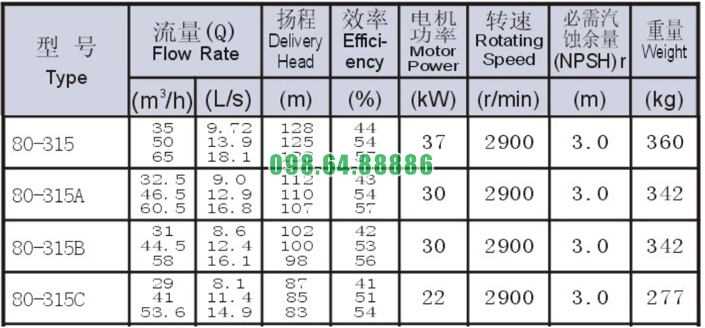 Bảng thông số kỹ thuật bơm nước trục ngang mã SLW80-ISW80-315 động cơ 37 kw