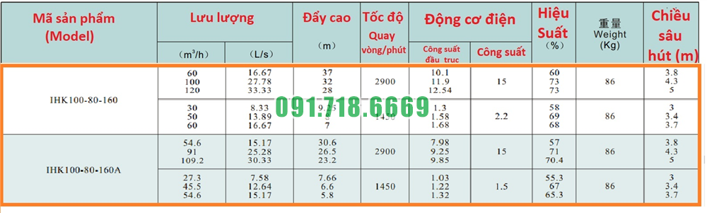 Bảng lưu lượng của máy bơm nước cánh hở IHK100-80-160 vật liệu inox 304