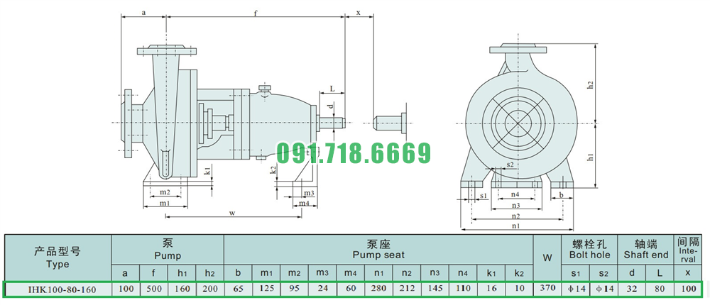 Kích thước của đầu máy bơm nước cánh hở IHK100-80-160 vật liệu inox 304