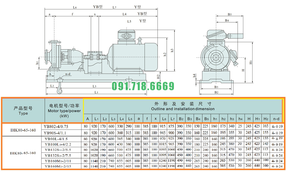 Kích thước lắp đặt của máy bơm nước cánh hở IHK100-80-160 vật liệu inox 304