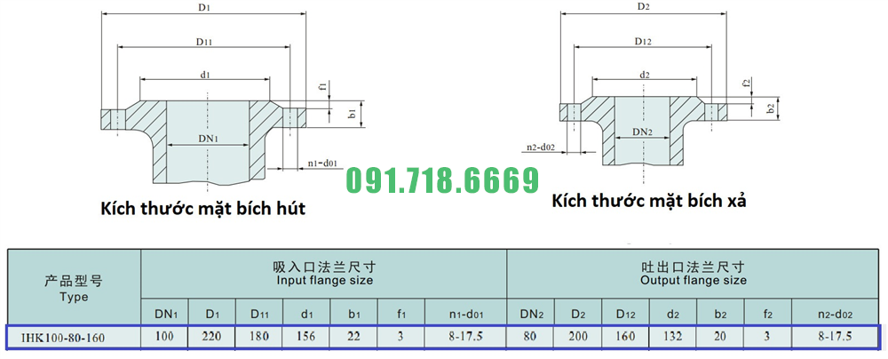 Kích thước mặt bích của máy bơm nước cánh hở IHK100-80-160 vật liệu inox 304