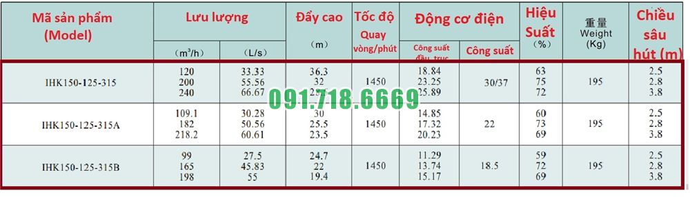 Bảng lưu lượng của máy bơm nước cánh hở IHK150-125-315 vật liệu inox 304