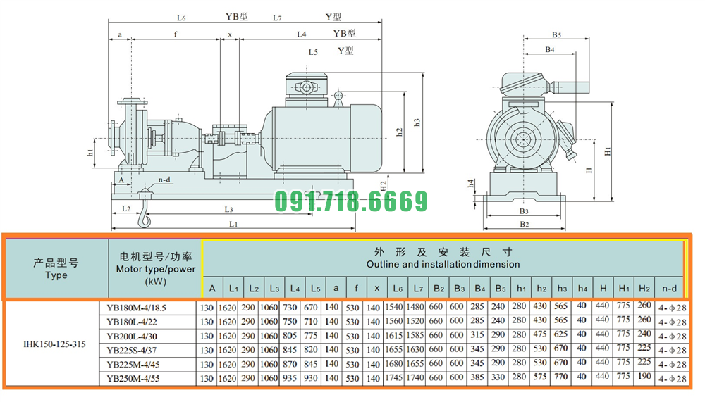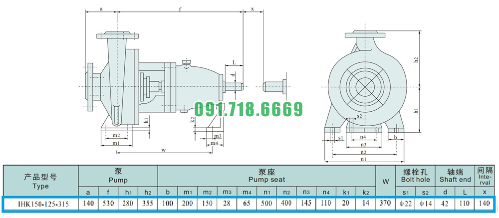 Kích thước của đầu máy bơm nước cánh hở IHK150-125-315 vật liệu inox 304