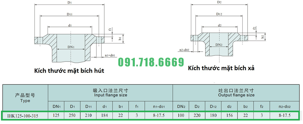 Kích thước mặt bích của máy bơm nước cánh hở IHK150-125-315 vật liệu inox 304