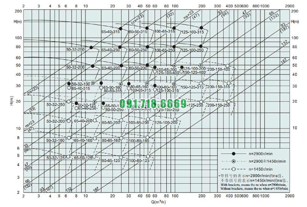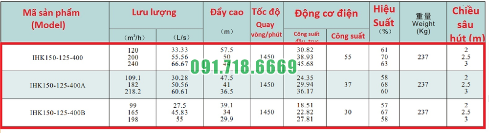 Bảng lưu lượng của máy bơm nước cánh hở IHK150-125-400 vật liệu inox 304
