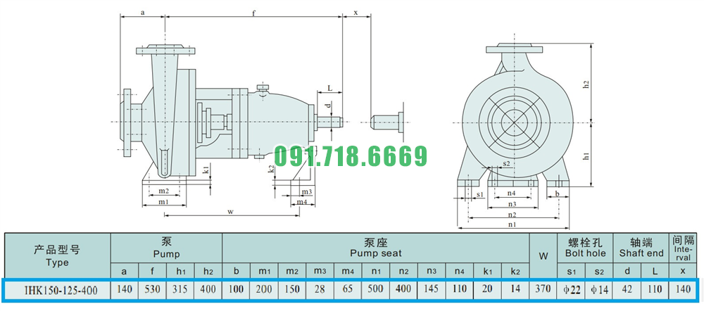 Kích thước của đầu máy bơm nước cánh hở IHK150-125-400 vật liệu inox 304