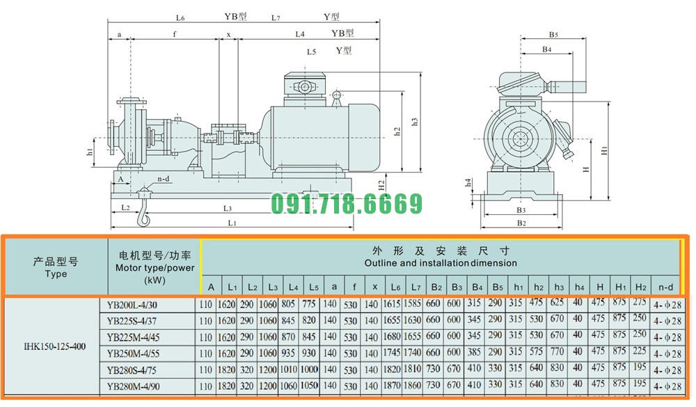 Kích thước lắp đặt của máy bơm nước cánh hở IHK150-125-400 vật liệu inox 304