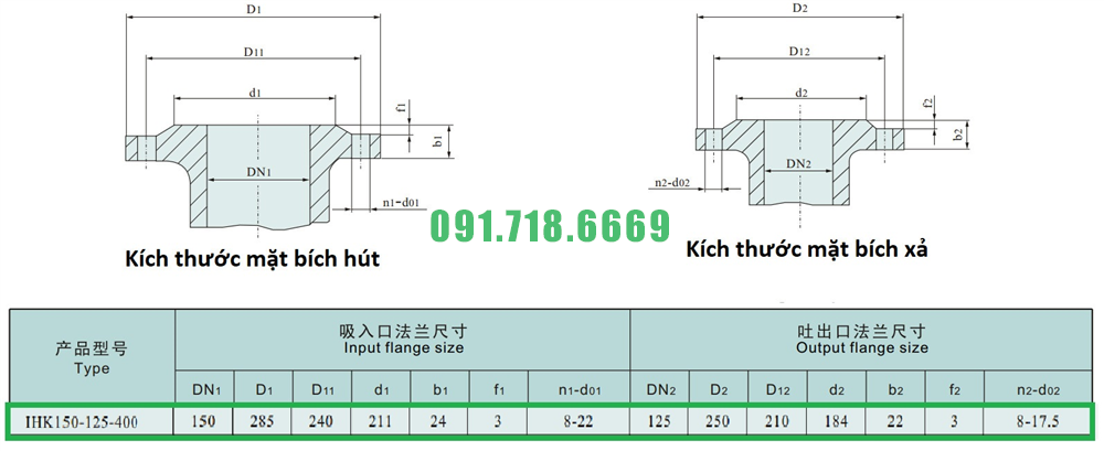 Kích thước mặt bích của máy bơm nước cánh hở IHK150-125-400 vật liệu inox 304