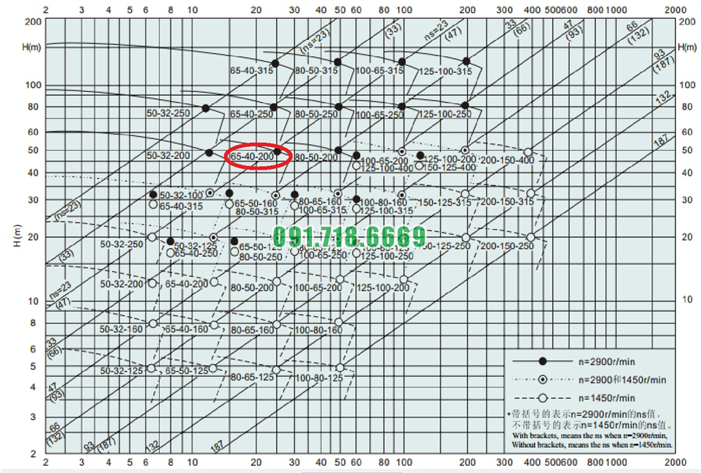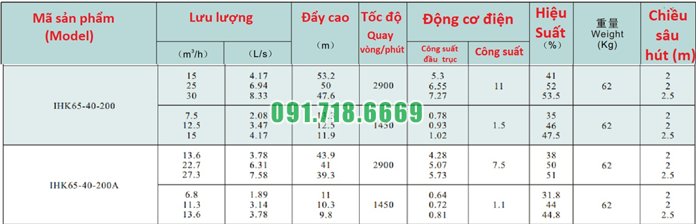 Bảng lưu lượng của máy bơm nước cánh hở IHK65-40-200 vỏ bằng inox 304
