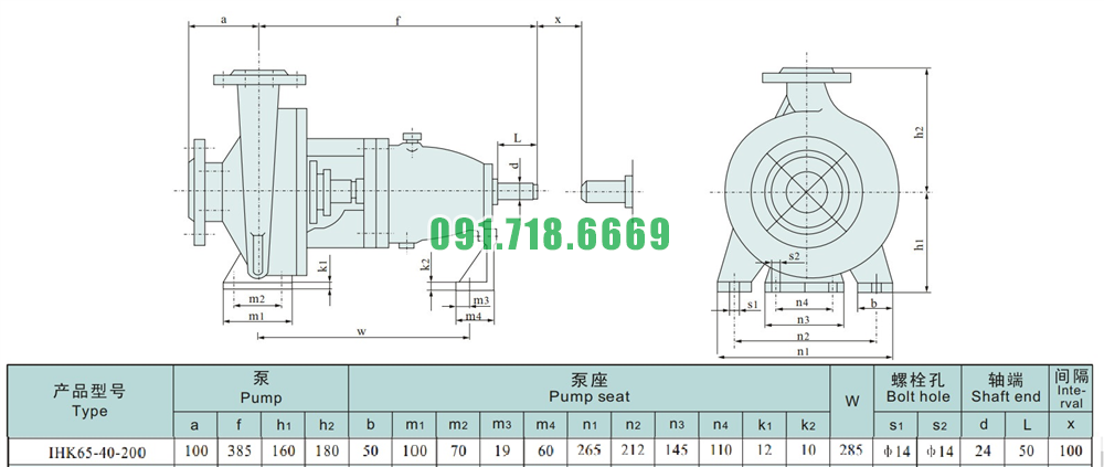 Kích thước của đầu máy bơm nước cánh hở IHK65-40-200 vỏ bằng inox 304