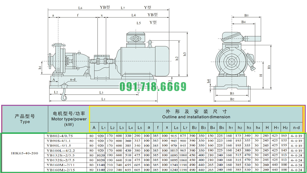 Kích thước lắp đặt của máy bơm nước cánh hở IHK65-40-200 vỏ bằng inox 304