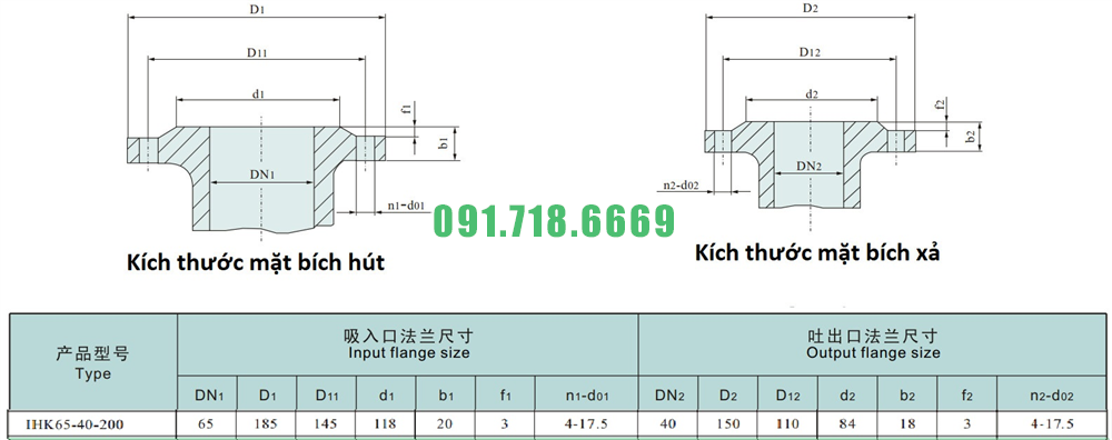 Kích thước mặt bích của máy bơm nước cánh hở IHK65-40-200 vỏ bằng inox 304