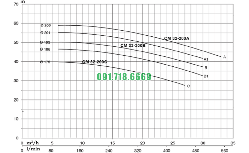 Đường cong hiệu suất máy bơm nước li tâm CM32-200B vật liệu gang FC200