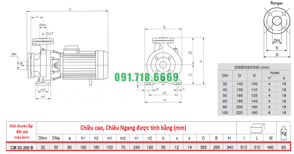 Kích thước máy bơm nước li tâm CM32-200B vật liệu gang FC200