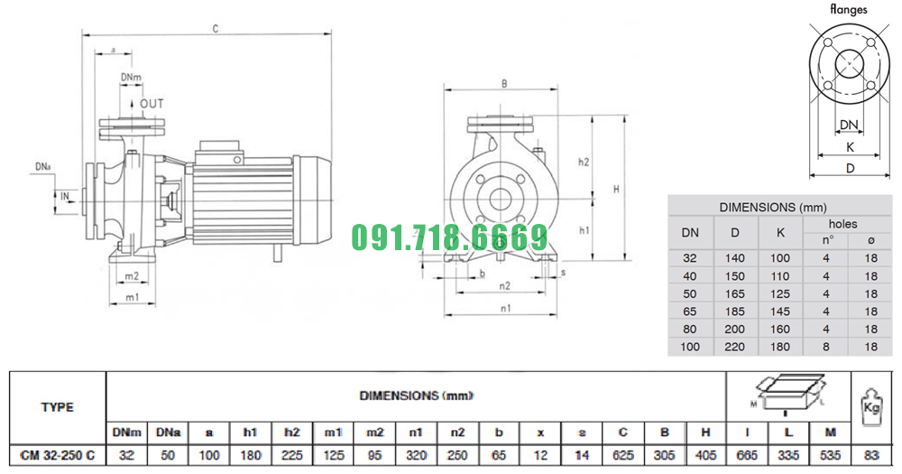 Kích thước máy bơm nước li tâm CM32-250C vật liệu gang FC200
