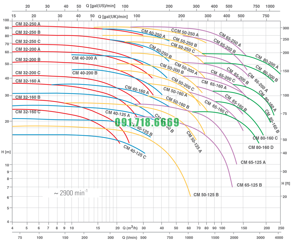 Đường cong hiệu suất máy bơm nước li tâm CM40-125C vật liệu gang FC200