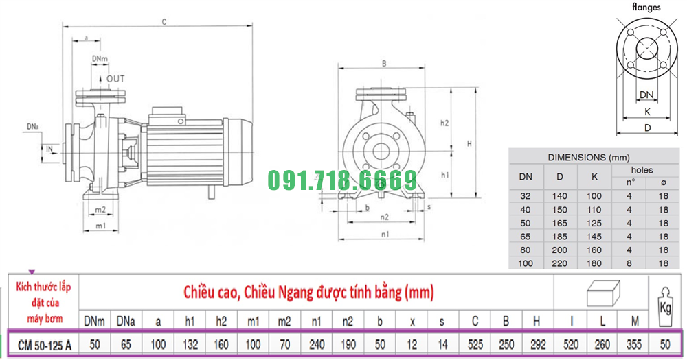 Kích thước máy bơm nước li tâm CM50-125A vật liệu gang FC200
