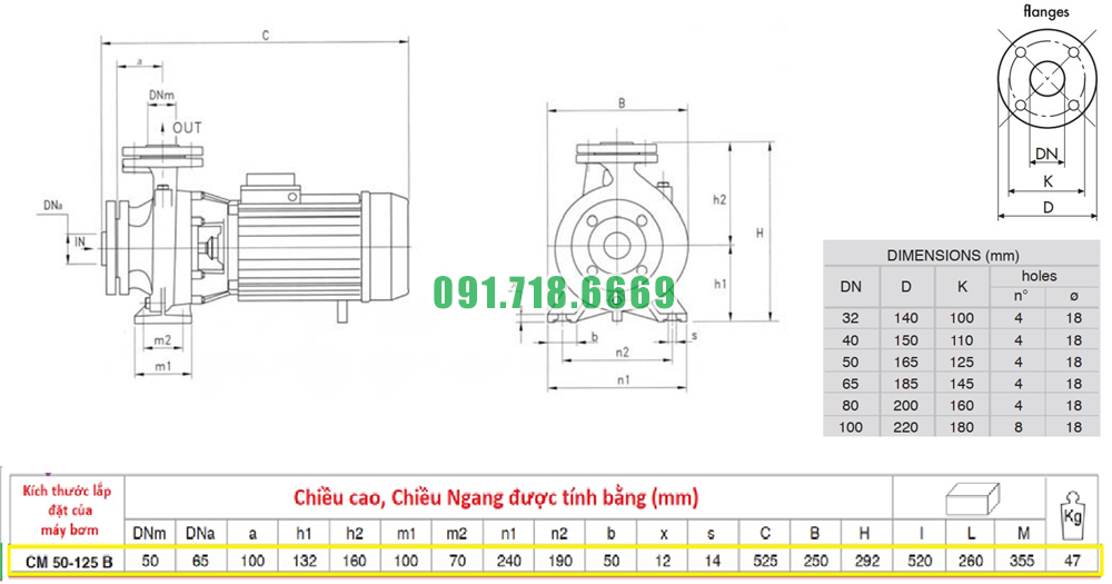 Kích thước máy bơm nước li tâm CM50-125B vật liệu gang FC200