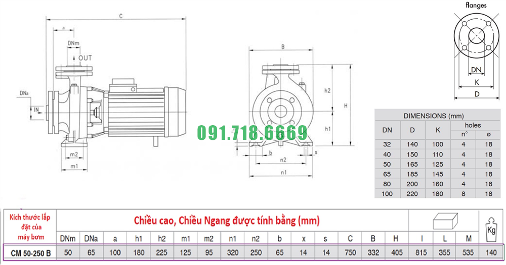 Kích thước máy bơm nước li tâm CM50-250B vật liệu gang FC200