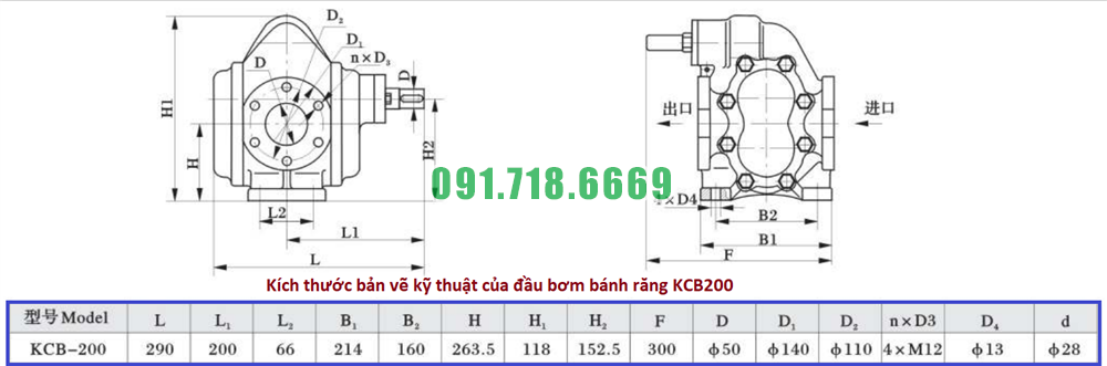 Bảng thông số kỹ thuật của bơm bánh răng KCB200 kích thước 50mm