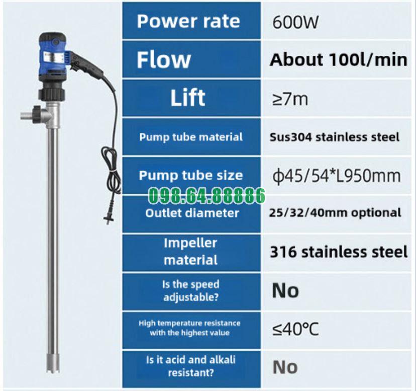 Bơm thùng phuy điện JDT-600W-304SUS được dùng rộng rãi để xử lý nhiều loại hóa chất như: