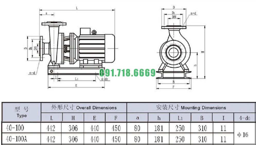 Bản vẽ cấu tạo và kích thước bơm li tâm trục ngang mã SLW-ISW40-100 lưu lượng 8.3 m3/h