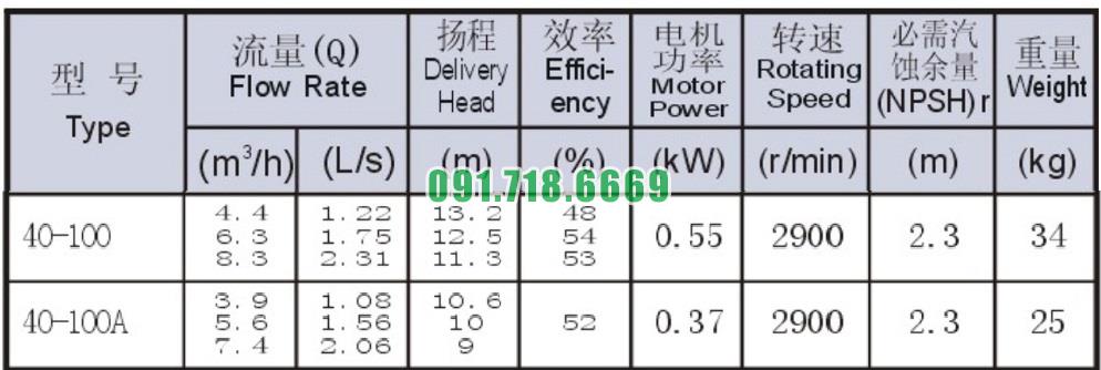 Bảng thông số kỹ thuật bơm li tâm trục ngang mã SLW-ISW40-100 lưu lượng 8.3 m3/h
