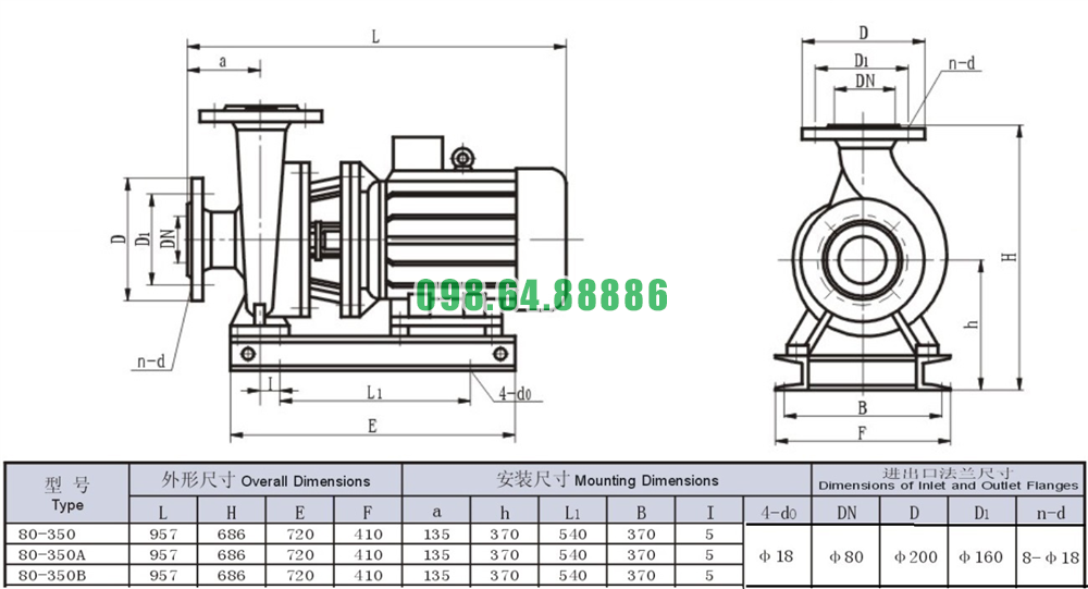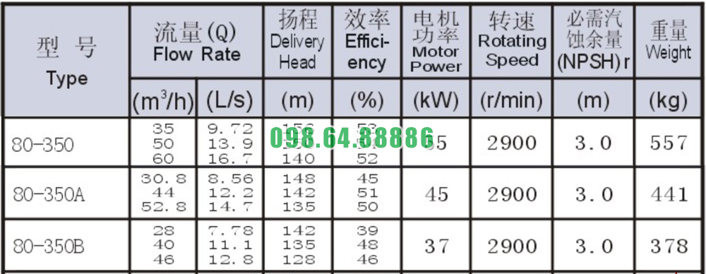 Bảng thông số kỹ thuật bơm li tâm trục ngang SLW80-ISW80-350 đẩy cao 156m và hút sâu 3m