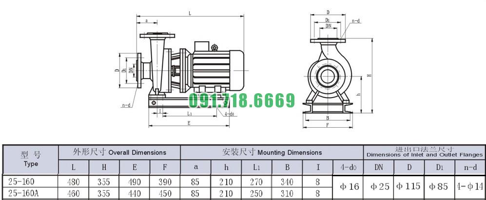 Bản vẽ cấu tạo và kích thước bơm nước li tâm trục ngang đẩy cao 33m mã ISW25-160