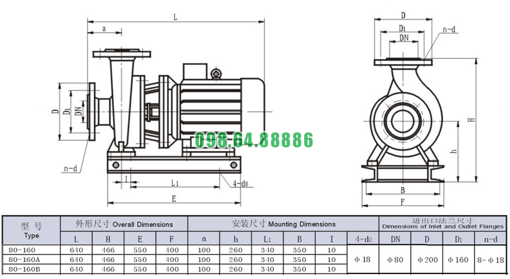 Bản vẽ cấu tạo và kích thước bơm nước li tâm trục ngang hút sâu 3m model SLW80-ISW80-160