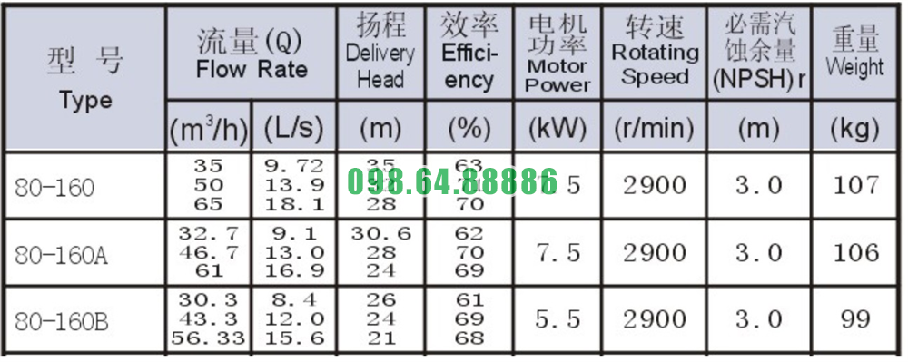Bảng thông số kỹ thuật bơm nước li tâm trục ngang hút sâu 3m model SLW80-ISW80-160