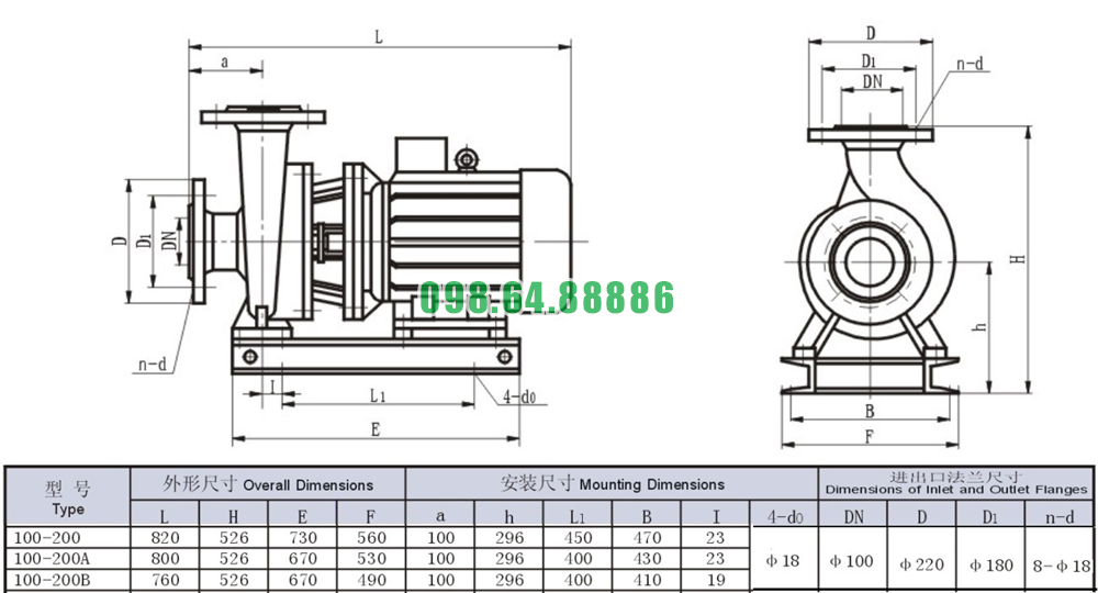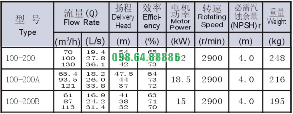Bảng thông số kỹ thuật bơm nước li tâm trục ngang SLW100-ISW100-200