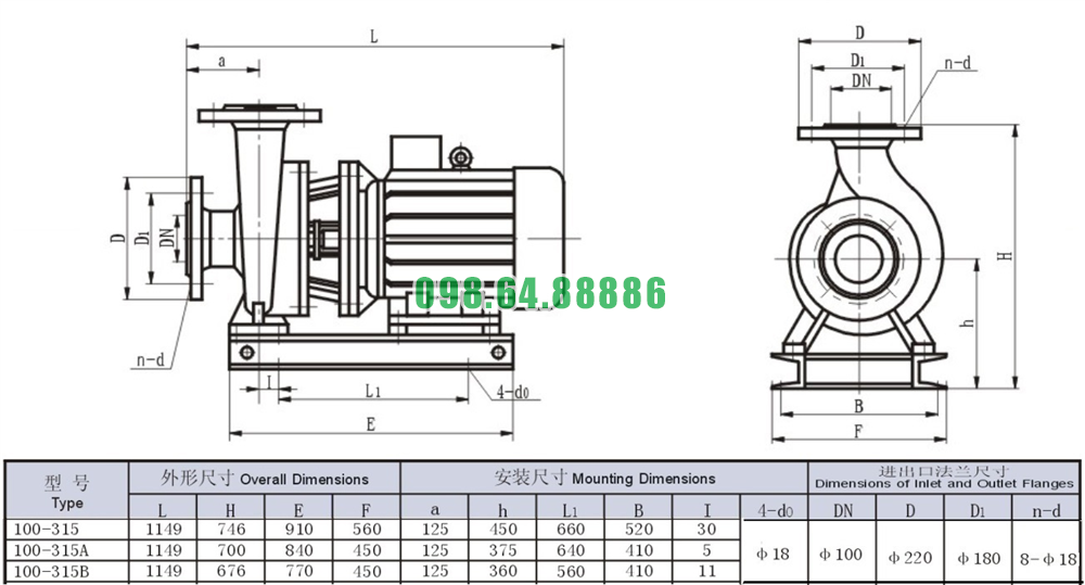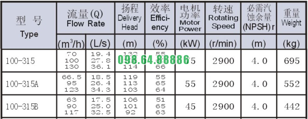 Bảng thông số kỹ thuật bơm nước li tâm trục ngang SLW100-ISW100-315