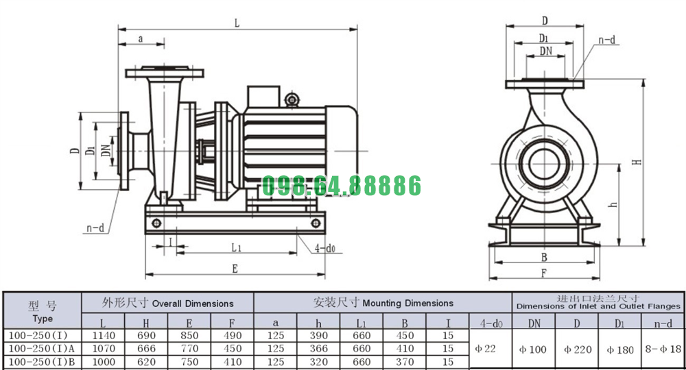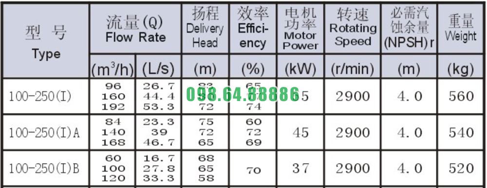 Bảng thông số kỹ thuật bơm nước li tâm trục ngang SLW100-ISW100-250-I