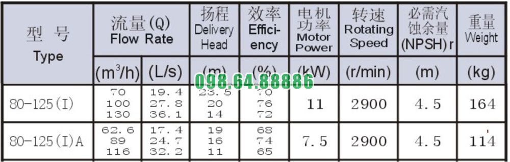 Bảng thông số kỹ thuật bơm nước li tâm trục ngang SLW80-ISW80-125-I