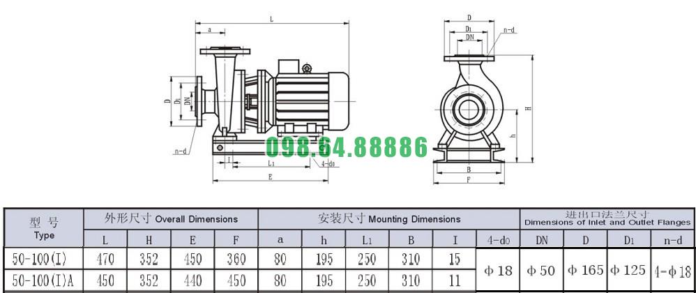 Bản vẽ cấu tạo và kích thước bơm nước nằm ngang SLW-ISW50-100-I