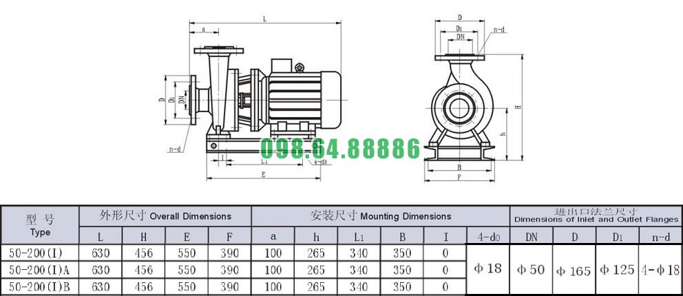 Bản vẽ cấu tạo và kích thước bơm nước nằm ngang SLW-ISW50-200-I hiệu suất 17.5 m3/h - 32.5 m3/h