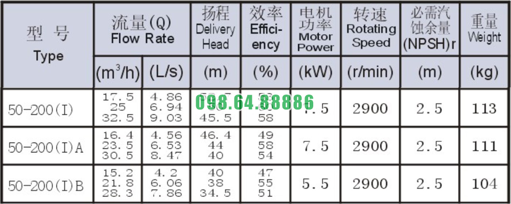 Bảng thông số kỹ thuật bơm nước nằm ngang SLW-ISW50-200-I hiệu suất 17.5 m3/h - 32.5 m3/h