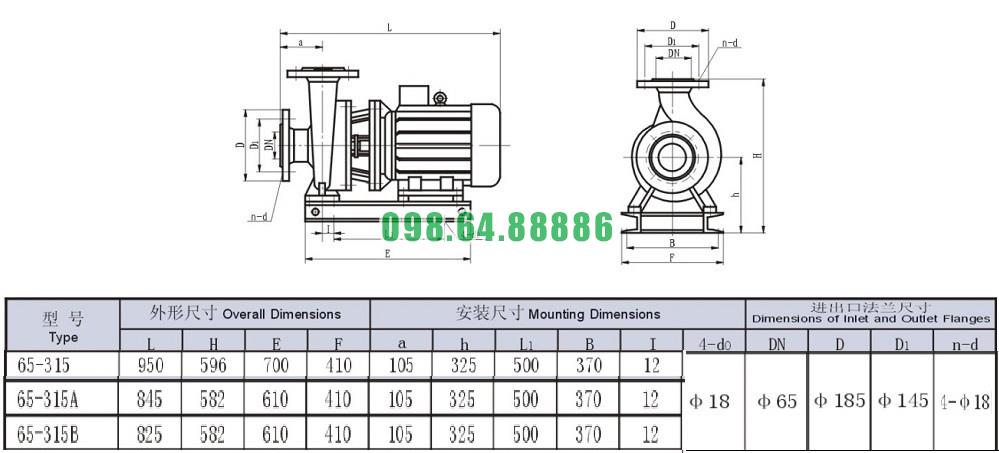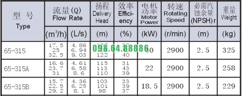 Bảng thông số kỹ thuật bơm nước nằm ngang SLW65-ISW65-315 độ hút sâu 2.5m