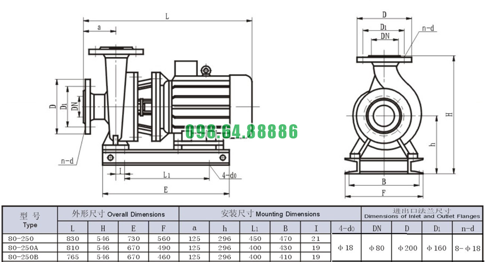 Bản vẽ cấu tạo và kích thước bơm nước nằm ngang SLW80-ISW80-250 độ hút sâu 3m