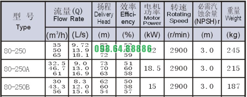 Bảng thông số kỹ thuật bơm nước nằm ngang SLW80-ISW80-250 độ hút sâu 3m