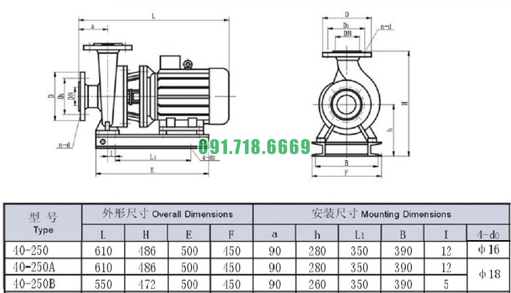 Bản vẽ cấu tạo và kích thước bơm nước trục ngang SLW-ISW40-250 hút sâu 2.3m
