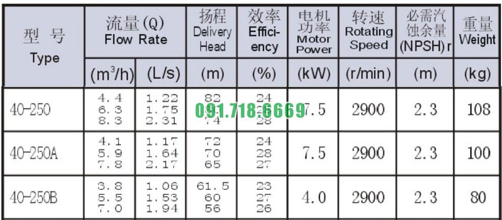 Bảng thông số kỹ thuật bơm nước trục ngang SLW-ISW40-250 hút sâu 2.3m
