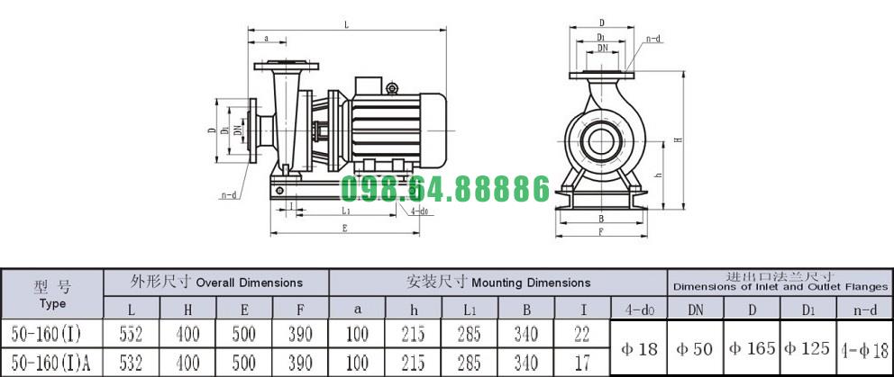 Bản vẽ cấu tạo và kích thước bơm nước trục ngang SLW-ISW50-160-I đẩy cao max 34.4m