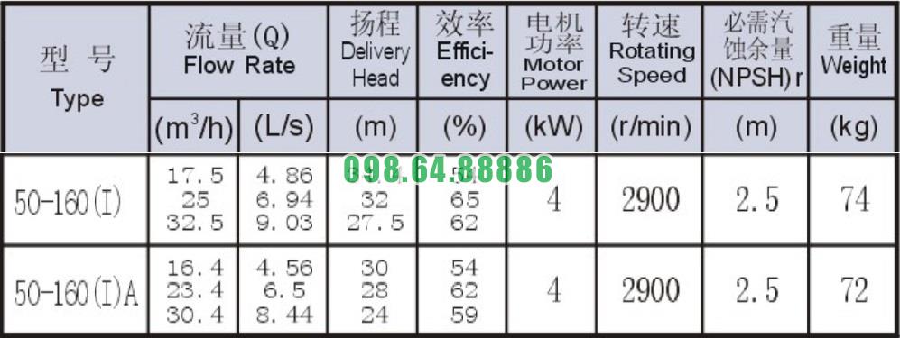 Bảng thông số kỹ thuật bơm nước trục ngang SLW-ISW50-160-I đẩy cao max 34.4m