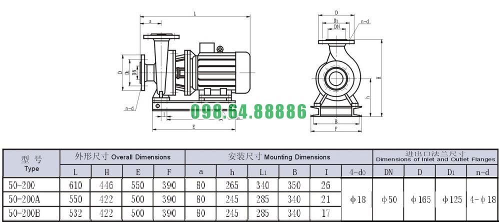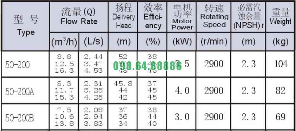 Bảng thông số kỹ thuật bơm nước trục ngang SLW-ISW50-200