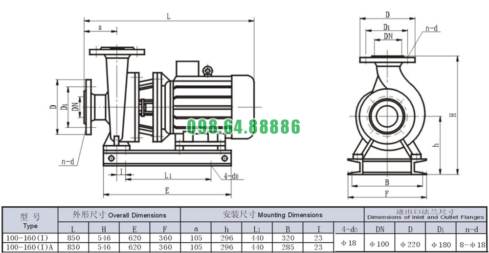 Bản vẽ cấu tạo và kích thước bơm nước trục ngang SLW100- ISW100-160-I lưu lượng 53.3 L/s